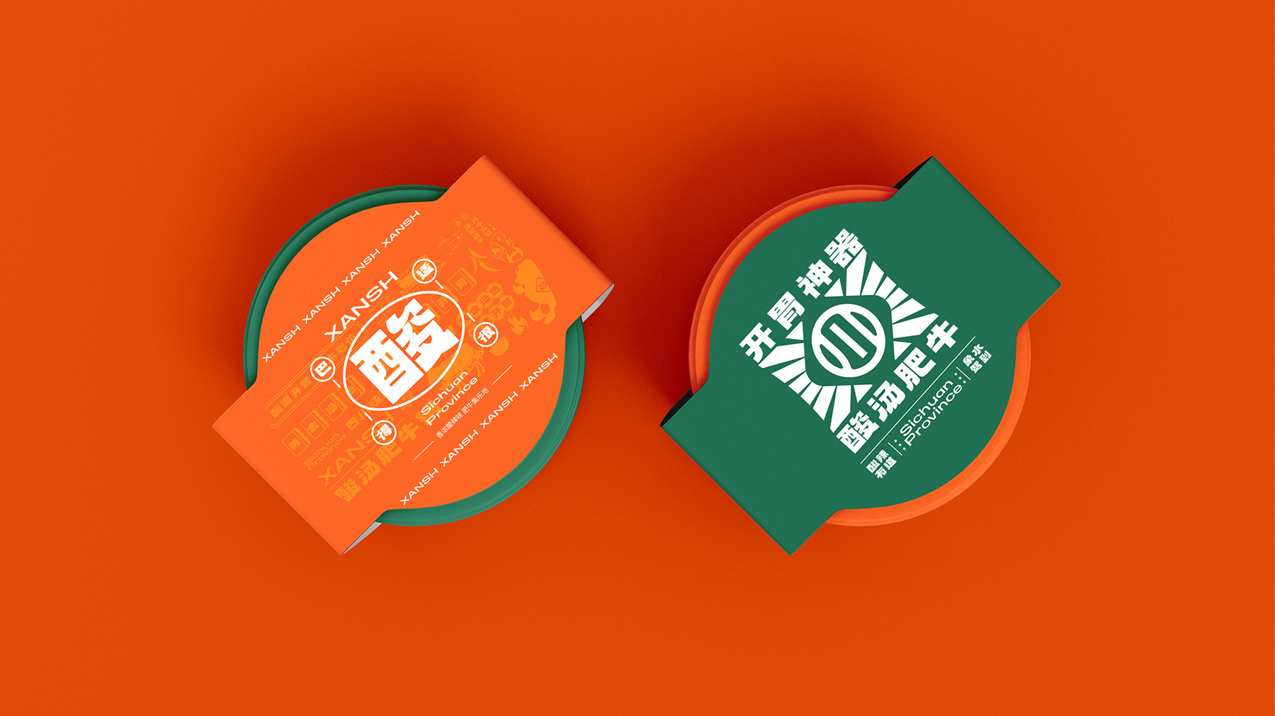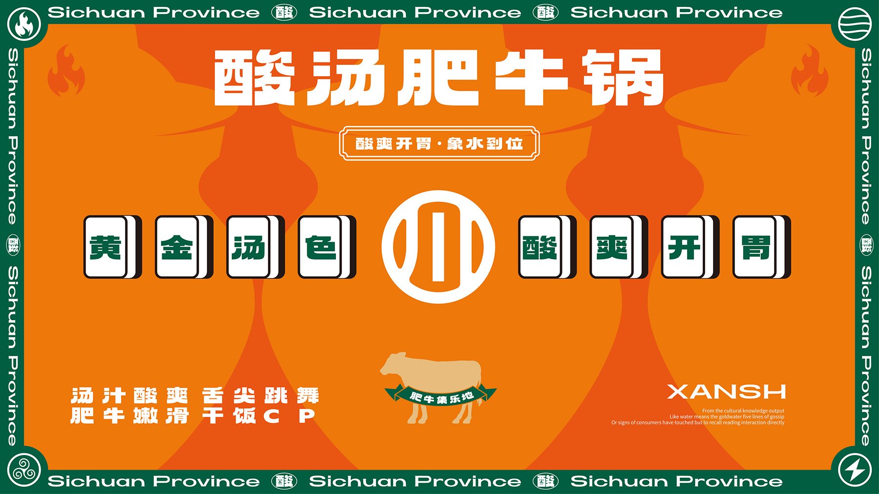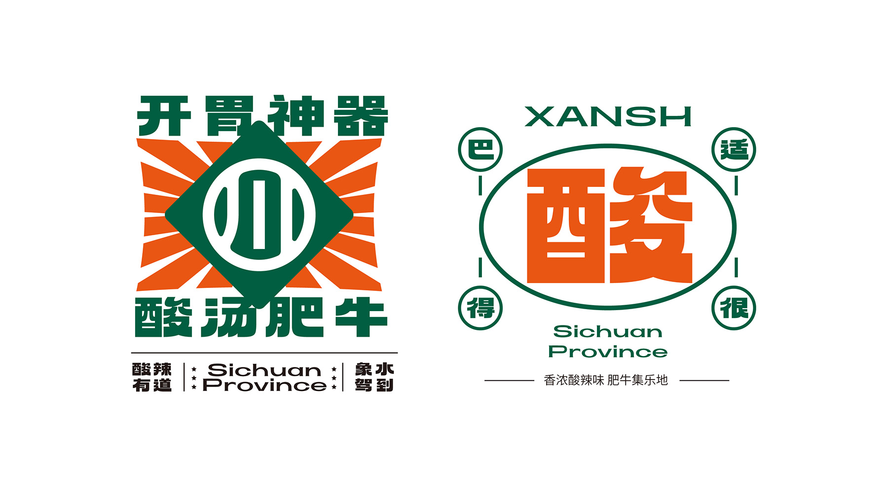 創(chuàng)意思路:色彩上橙黃取態(tài)黃金湯色,喚醒食欲;綠色作點(diǎn)睛之筆,與橙黃形成味覺聯(lián)想的色彩呼應(yīng),雙重強(qiáng)化 “酸” 的感官記憶,凸顯酸爽開胃的特質(zhì)。?圖形設(shè)計(jì)以老壇輪廓為基底、結(jié)合麻將、臉譜等元素錨定地道川味,“酸” 字則直點(diǎn)味覺核心。整體直觀傳遞四川口味、老壇釀造的酸爽開胃屬性。