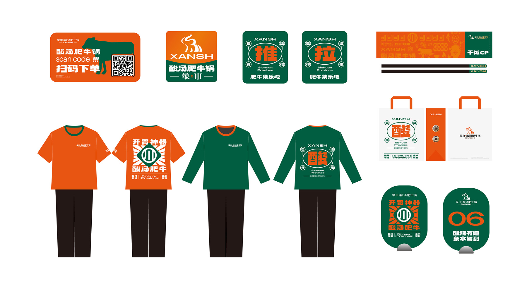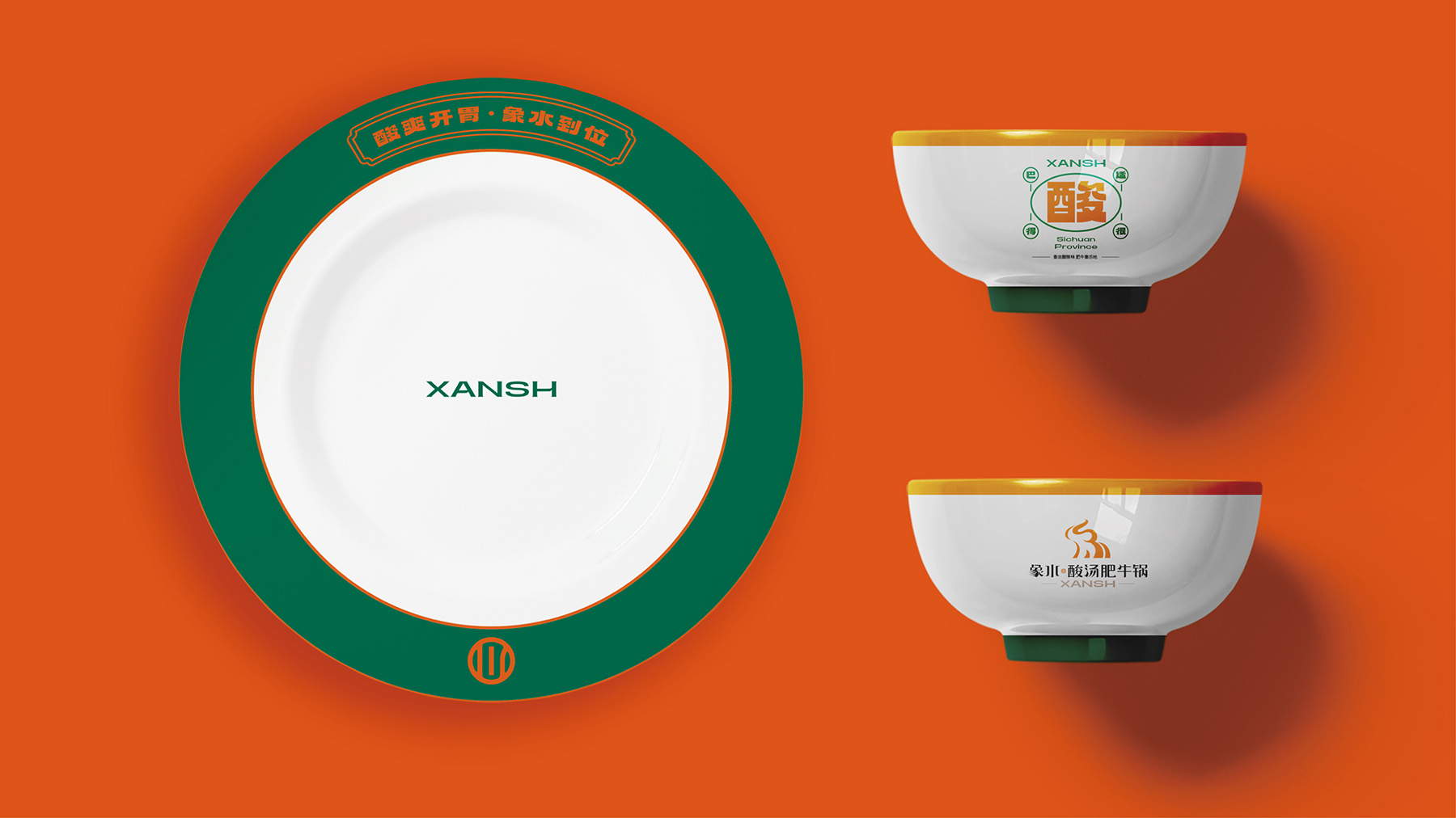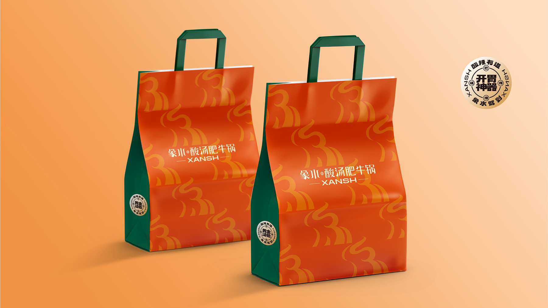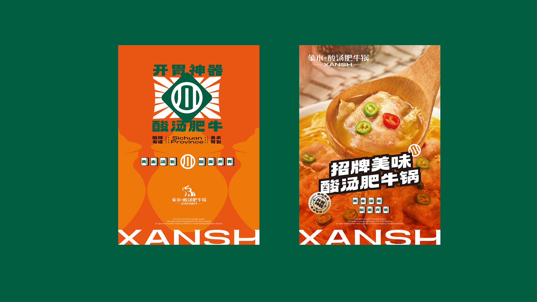 創(chuàng)意思路:色彩上橙黃取態(tài)黃金湯色,喚醒食欲;綠色作點(diǎn)睛之筆,與橙黃形成味覺聯(lián)想的色彩呼應(yīng),雙重強(qiáng)化 “酸” 的感官記憶,凸顯酸爽開胃的特質(zhì)。?圖形設(shè)計(jì)以老壇輪廓為基底、結(jié)合麻將、臉譜等元素錨定地道川味,“酸” 字則直點(diǎn)味覺核心。整體直觀傳遞四川口味、老壇釀造的酸爽開胃屬性。