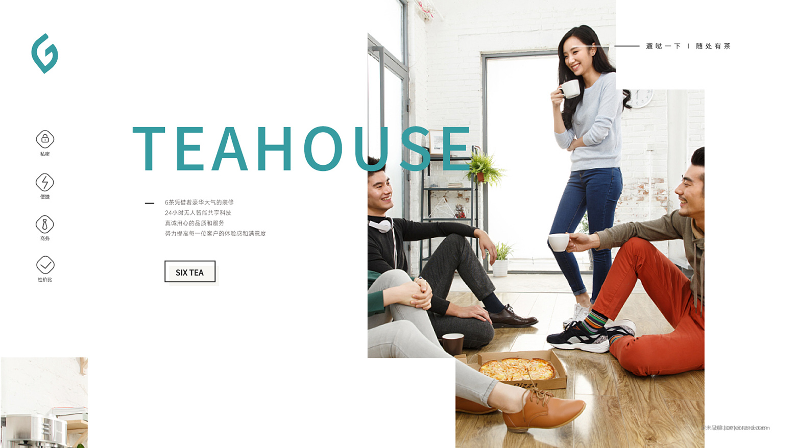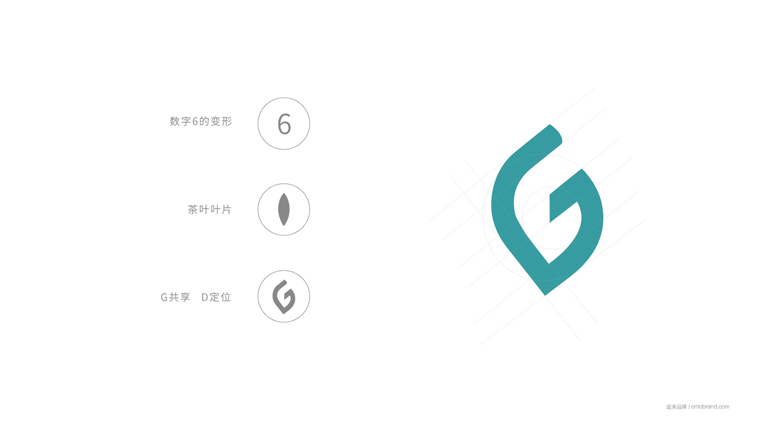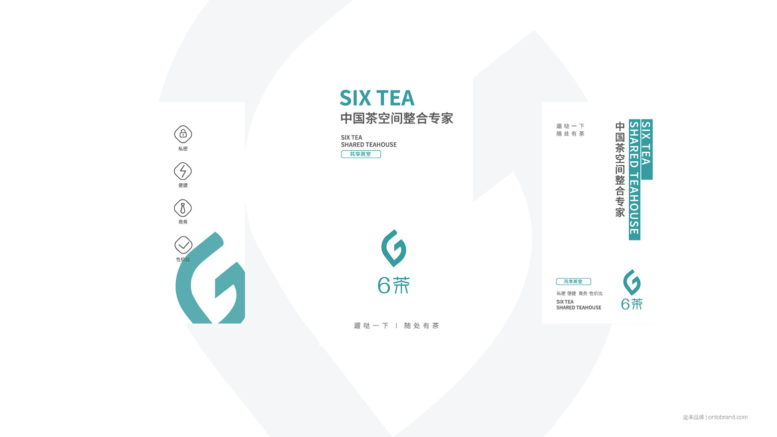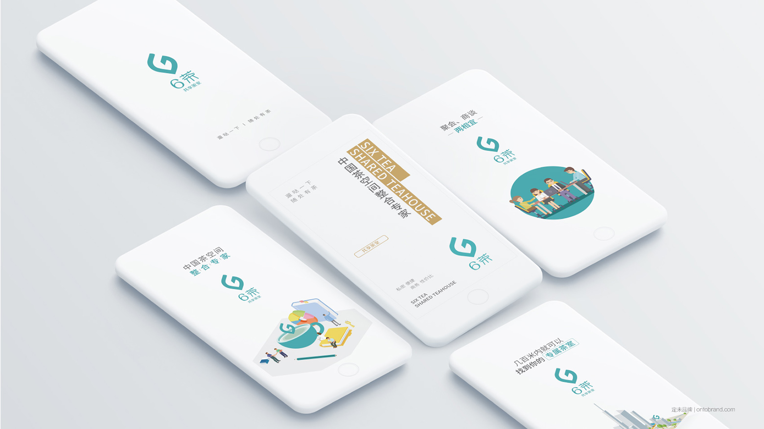 創意思路:整體形象采用新中式與互聯網屬性融合的風格,LOGO設計以品牌名稱“6”作為設計元素進行創作,6的形態含有茶葉、G(共享)、定位點的內涵,突出了6茶共享茶室的傳統+互聯網的行業屬性。