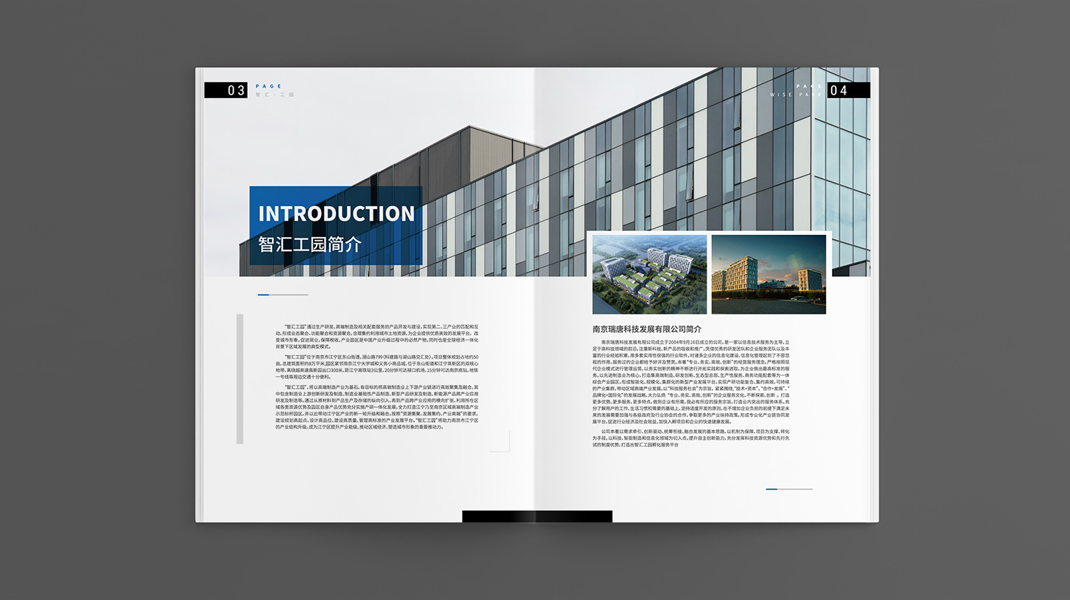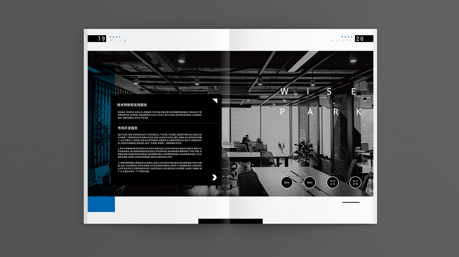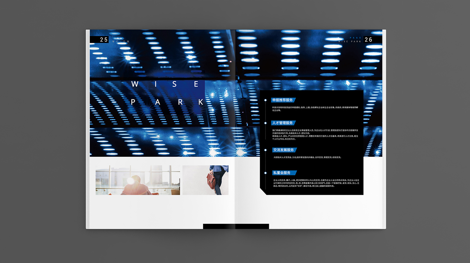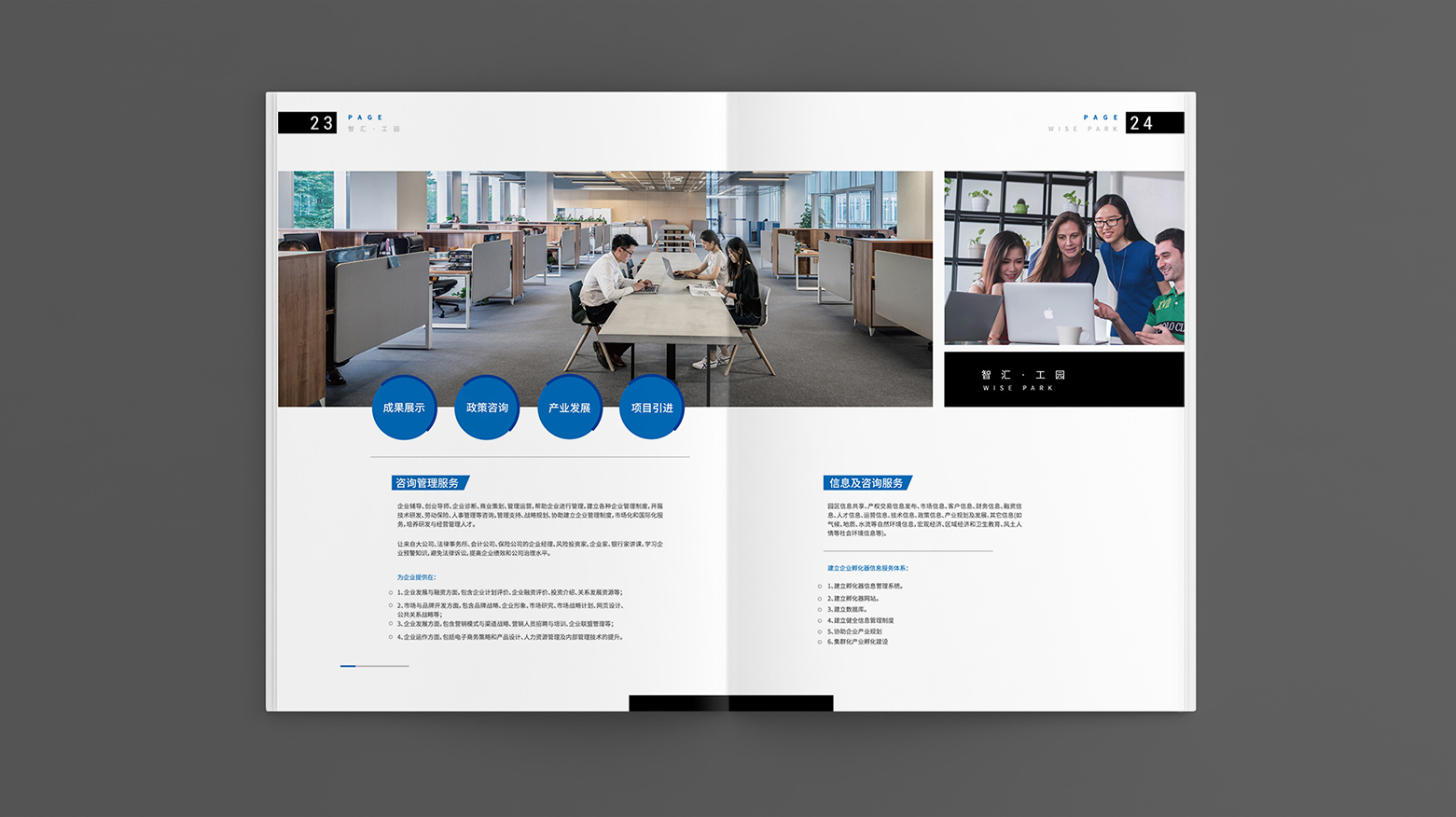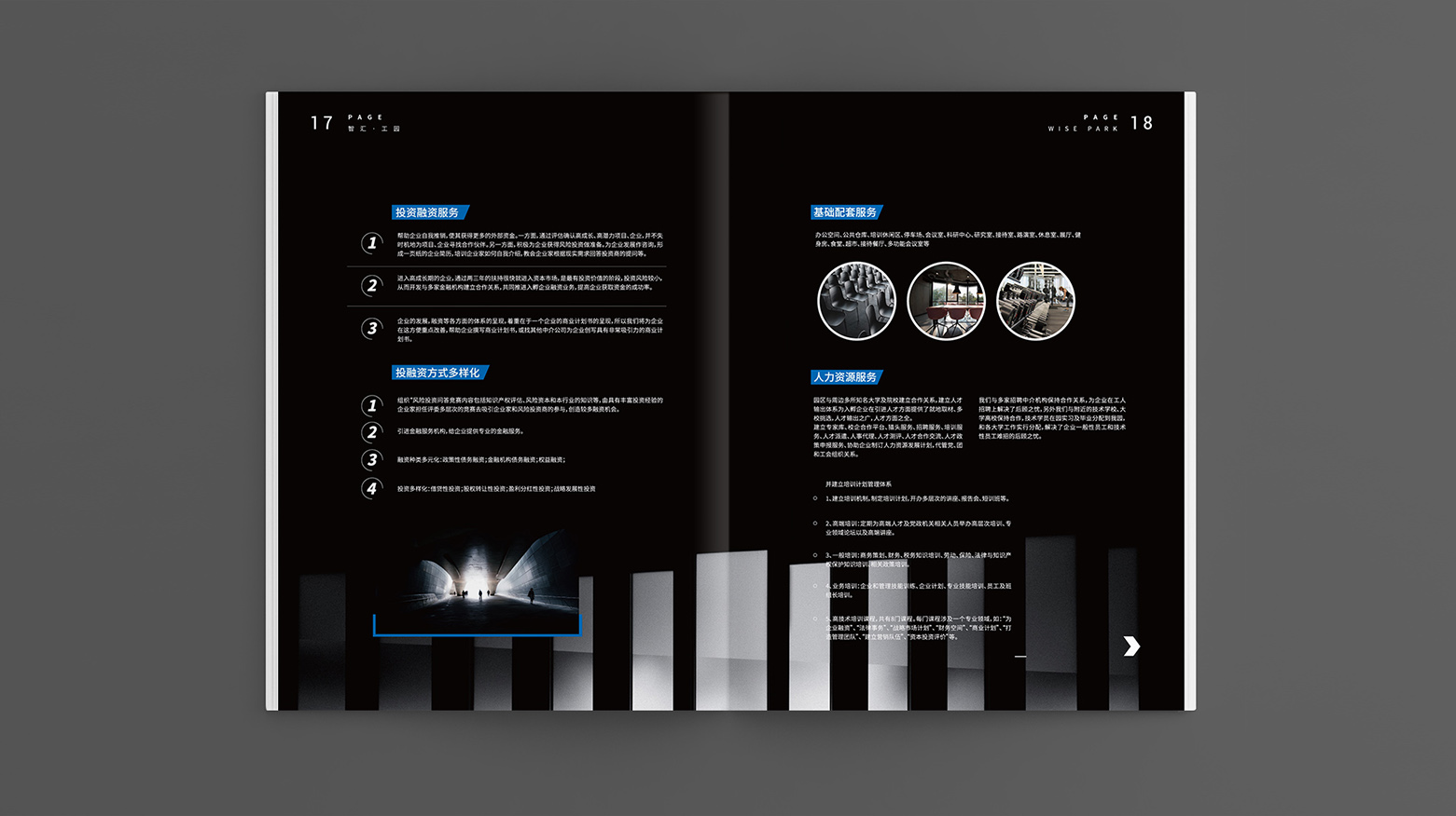 創意思路:畫冊整體風格現代簡約、工業風格。以黑白藍為主色調,突出以科技、智能制造的智匯工園的行業特征。