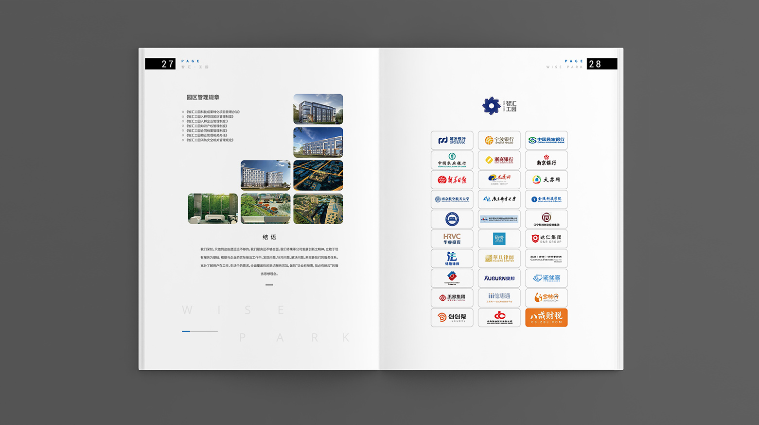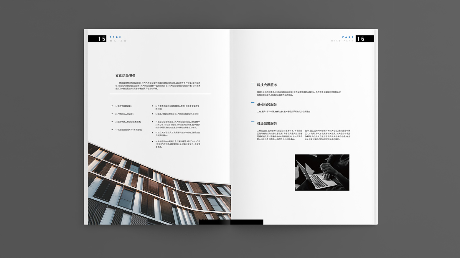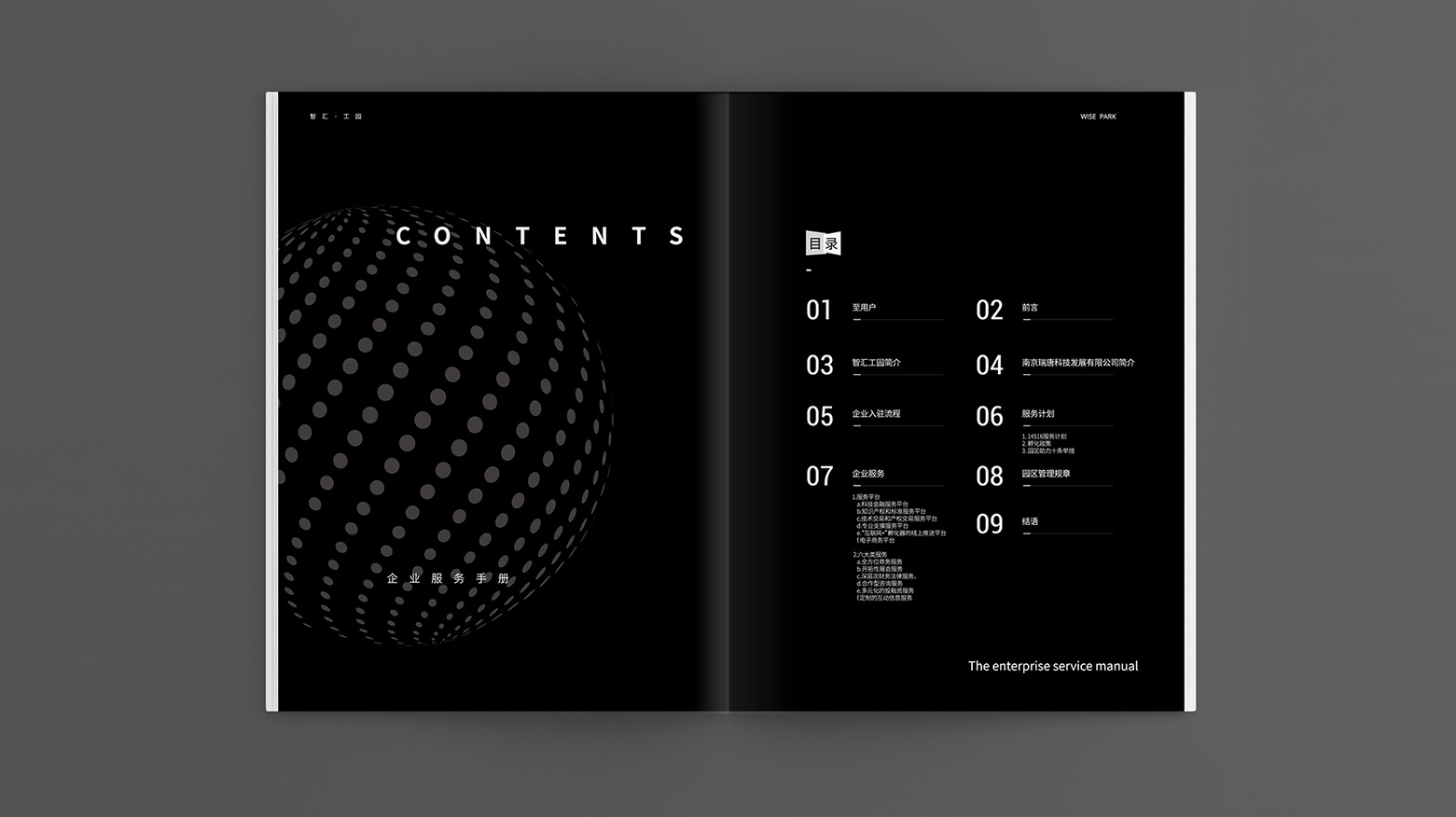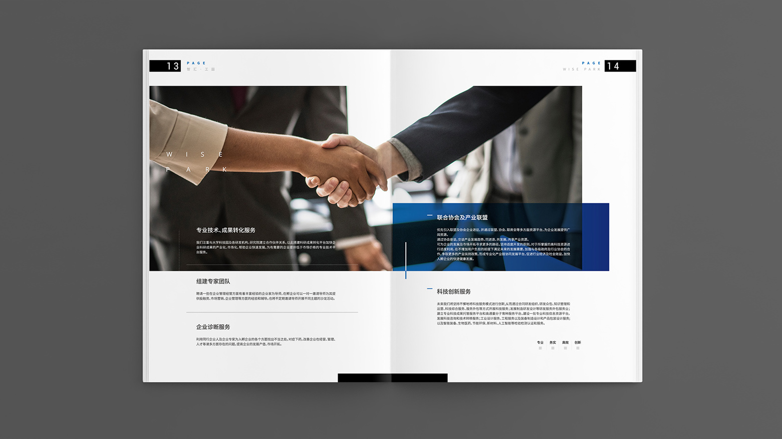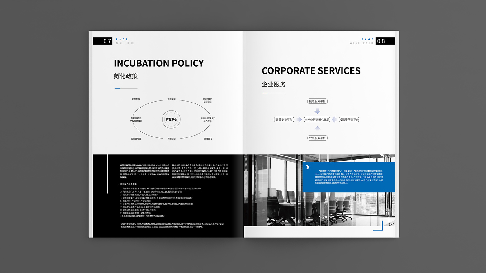 創意思路:畫冊整體風格現代簡約、工業風格。以黑白藍為主色調,突出以科技、智能制造的智匯工園的行業特征。