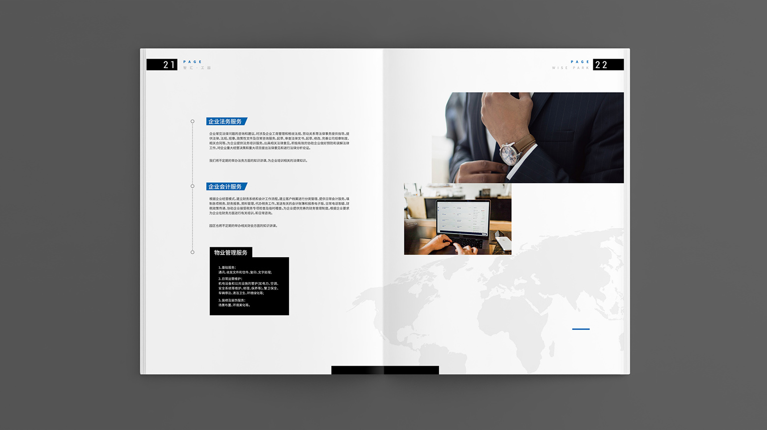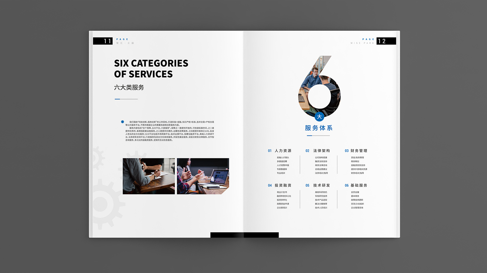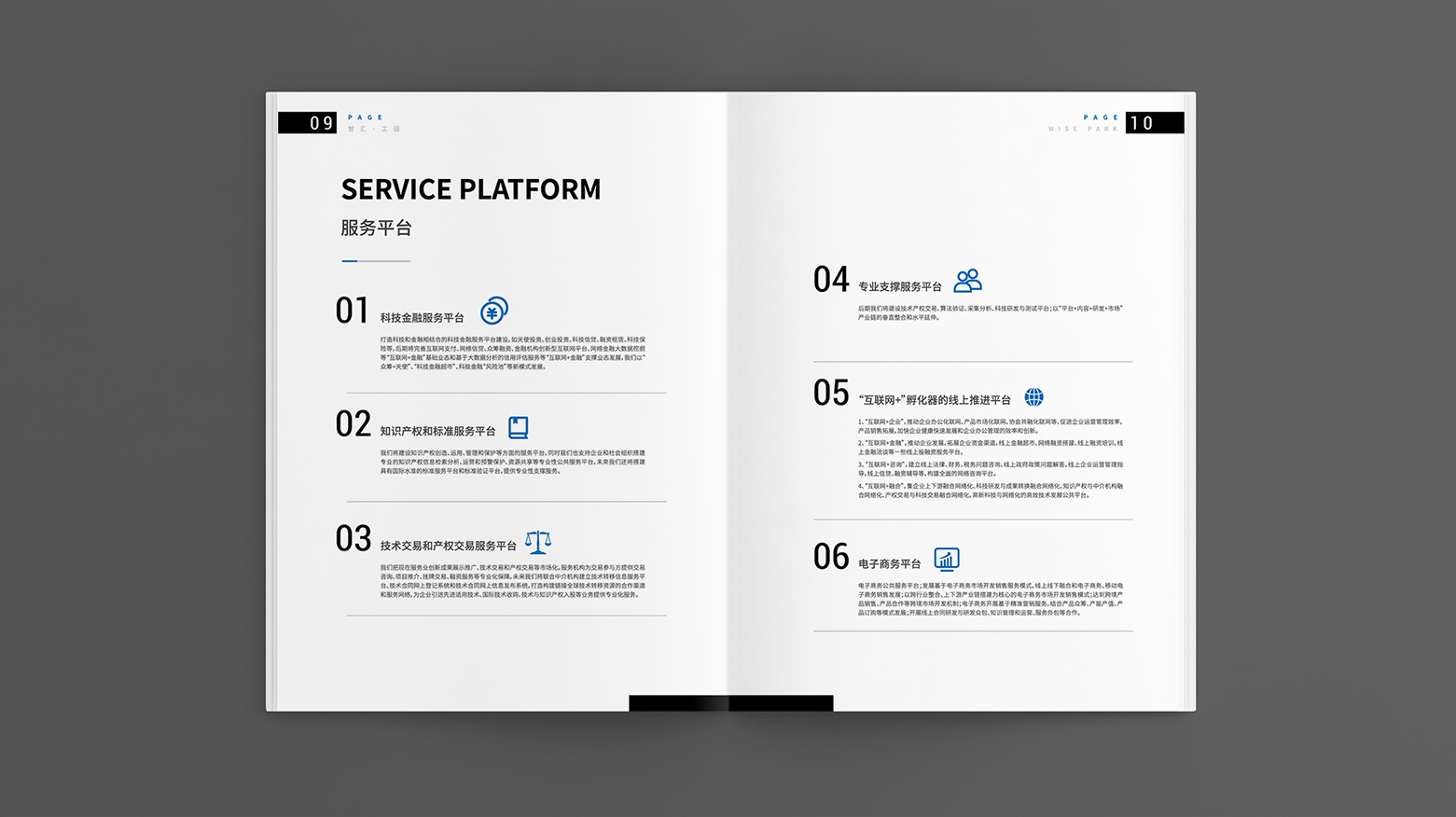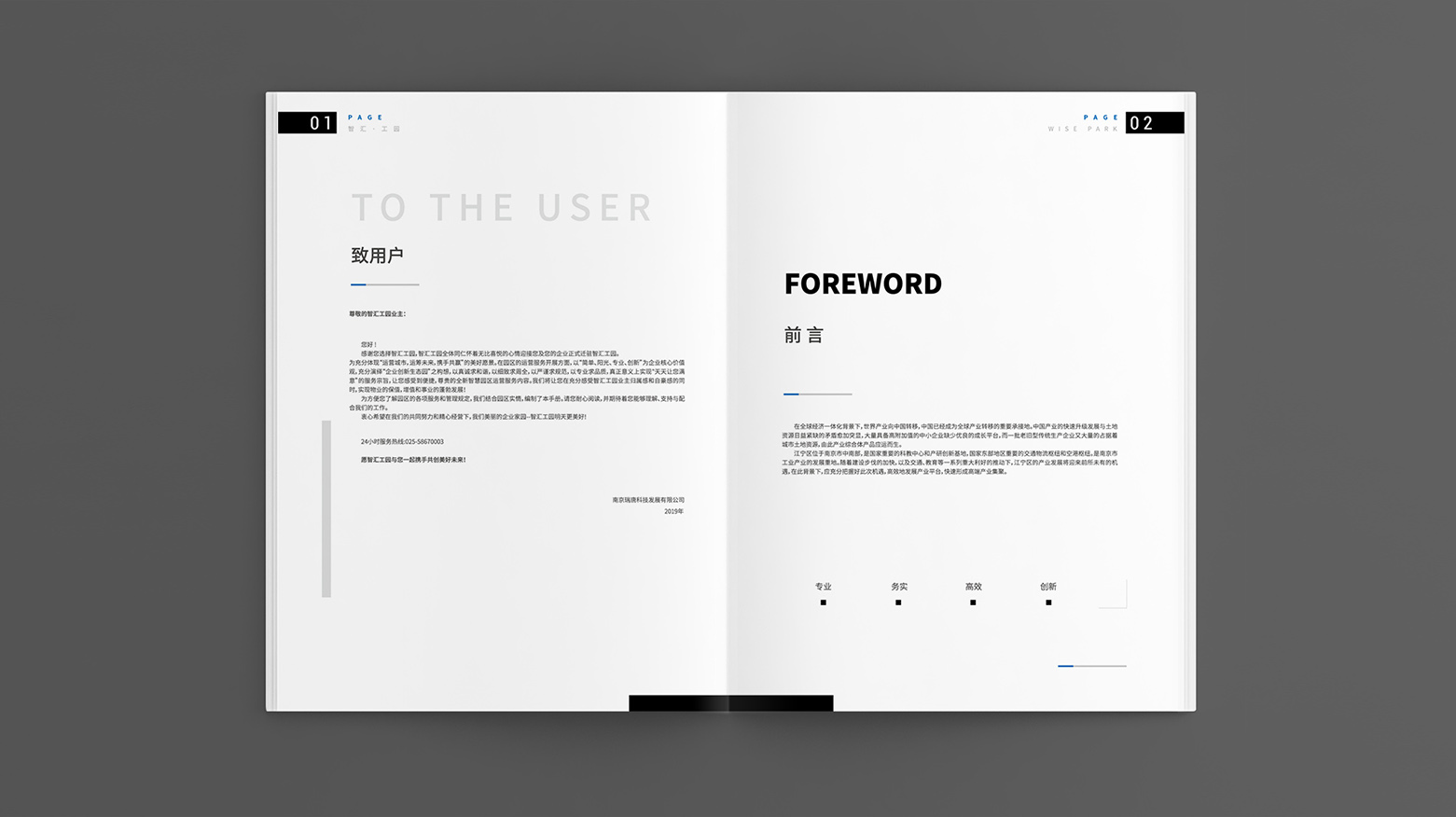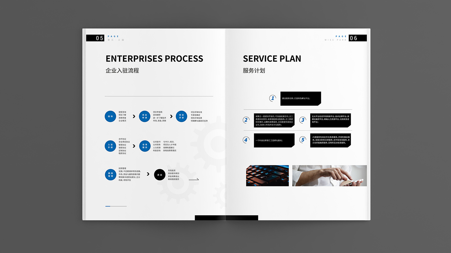 創意思路:畫冊整體風格現代簡約、工業風格。以黑白藍為主色調,突出以科技、智能制造的智匯工園的行業特征。