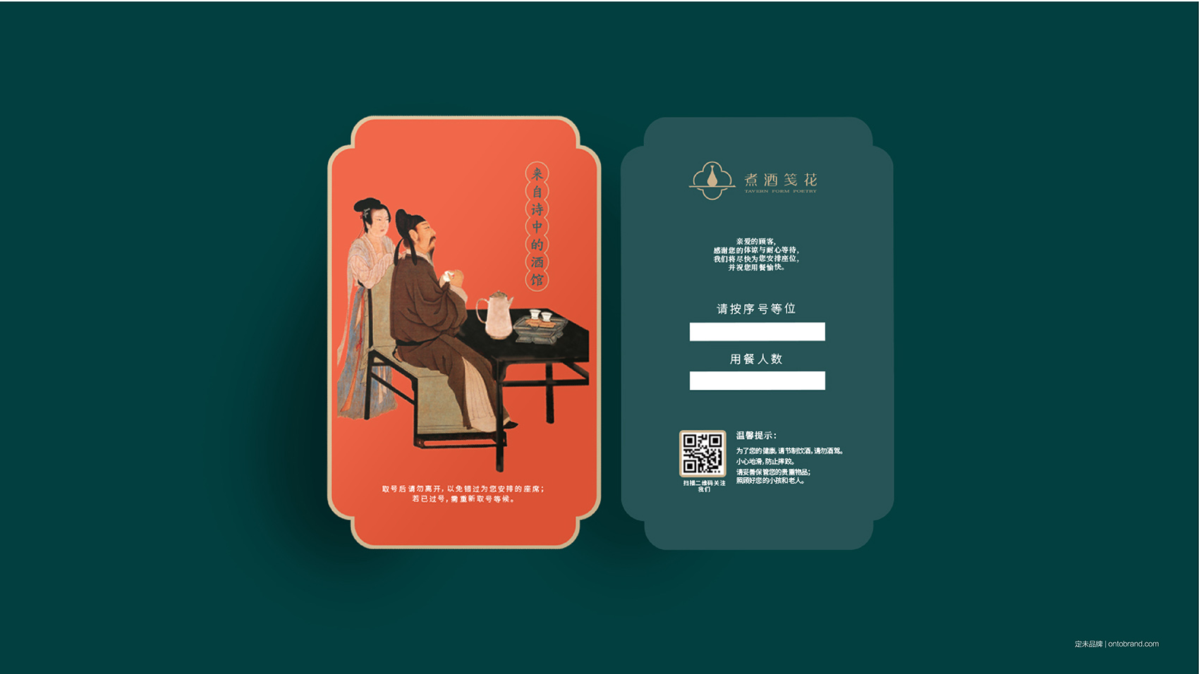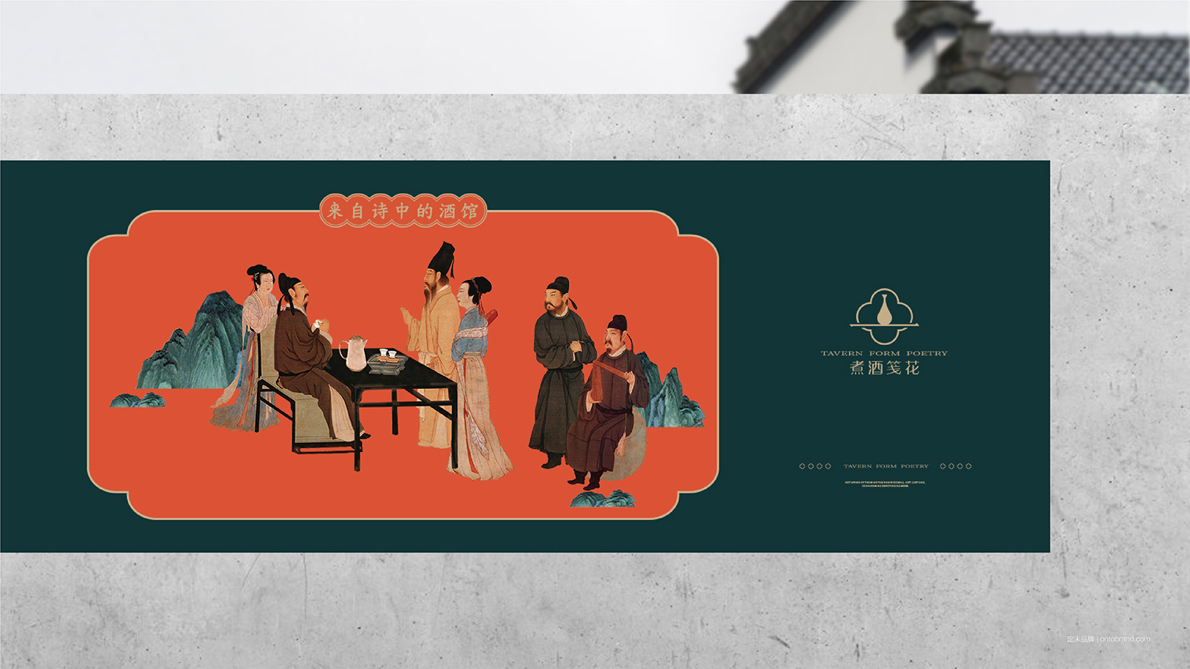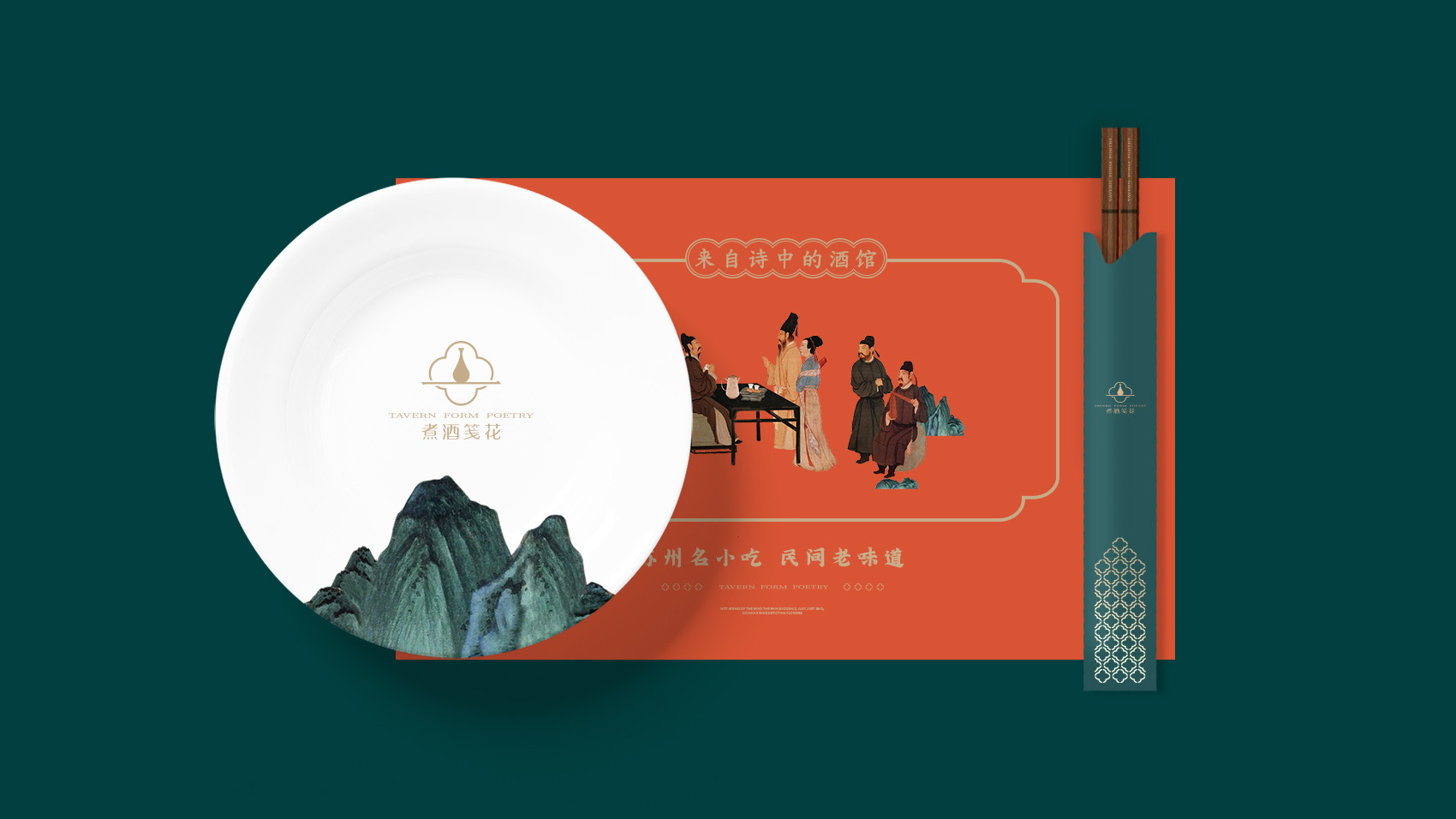 創(chuàng)意思路:【煮酒箋花】出自宋代李清照:不怕風(fēng)狂雨驟,恰才稱,煮酒箋花,不愿做風(fēng)流人物,獨(dú)作熏香、煮酒、品茶,看雨后殘花的那一人,怡然自得,這就是項(xiàng)目創(chuàng)始人的向食客傳達(dá)的雅致情懷。升級后的品牌調(diào)性更具內(nèi)涵,透過花窗,看到了江南古典園林,山水縈繞,亭榭樓閣,花木繁茂,更有觥籌交錯,今日良宴會,喧笑滿人間的穿越千年的夢境。