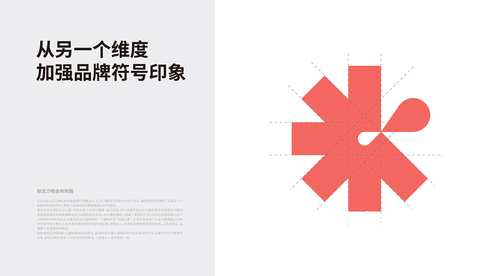 創意思路:以當下最流行的扁平化設計手法,高度概括提煉圖形,呈現出一個嶄新的的視覺符號。脫離了常規的行業LOGO打破常規進行設計,將原有對稱的花朵以水滴的形式打破制作出一個圖形外的“點睛之筆”。體現品牌獨特的視覺審美,以及對獨立、自強勇于嘗試精神的概括。