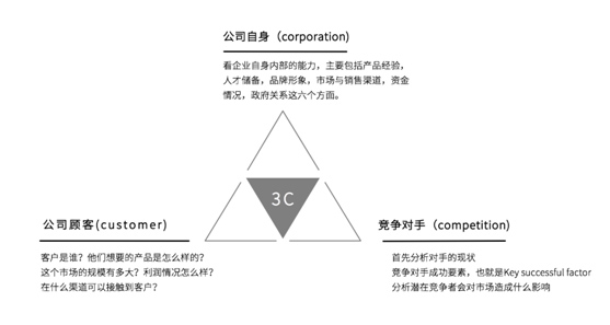 3C戰略模型,由管理學家大前研一提出,他認為在制定任何營銷戰略時,都必須考慮這三個因素:顧客需求,競爭對手情況公司自身能力或資源。