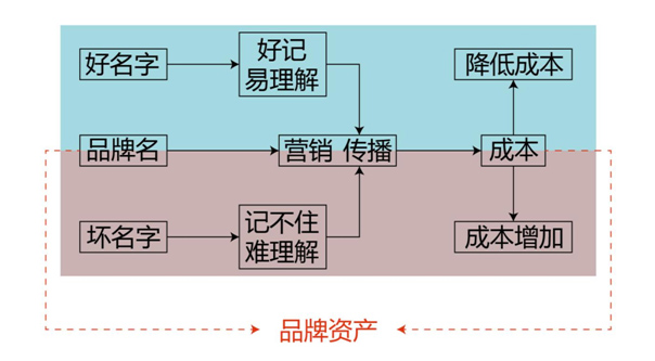 從原理圖中我們可以看出,好名字在營銷傳播中可以節約企業成本,不好的名字則反之。企業投入的這些成本,最終都會形成品牌資產。如果花錢投一個不好的名字,這些費用可能會浪費一大部分,甚至積累為零,無法形成品牌資產。
