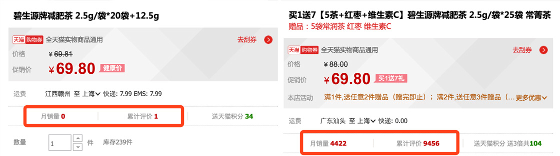 人都是從眾的,絕大多數人都不想做第一個吃螃蟹的人,所以你要用數據證明,在你前面已經有很多人吃過螃蟹。下面這兩個產品,你更愿意買哪個?